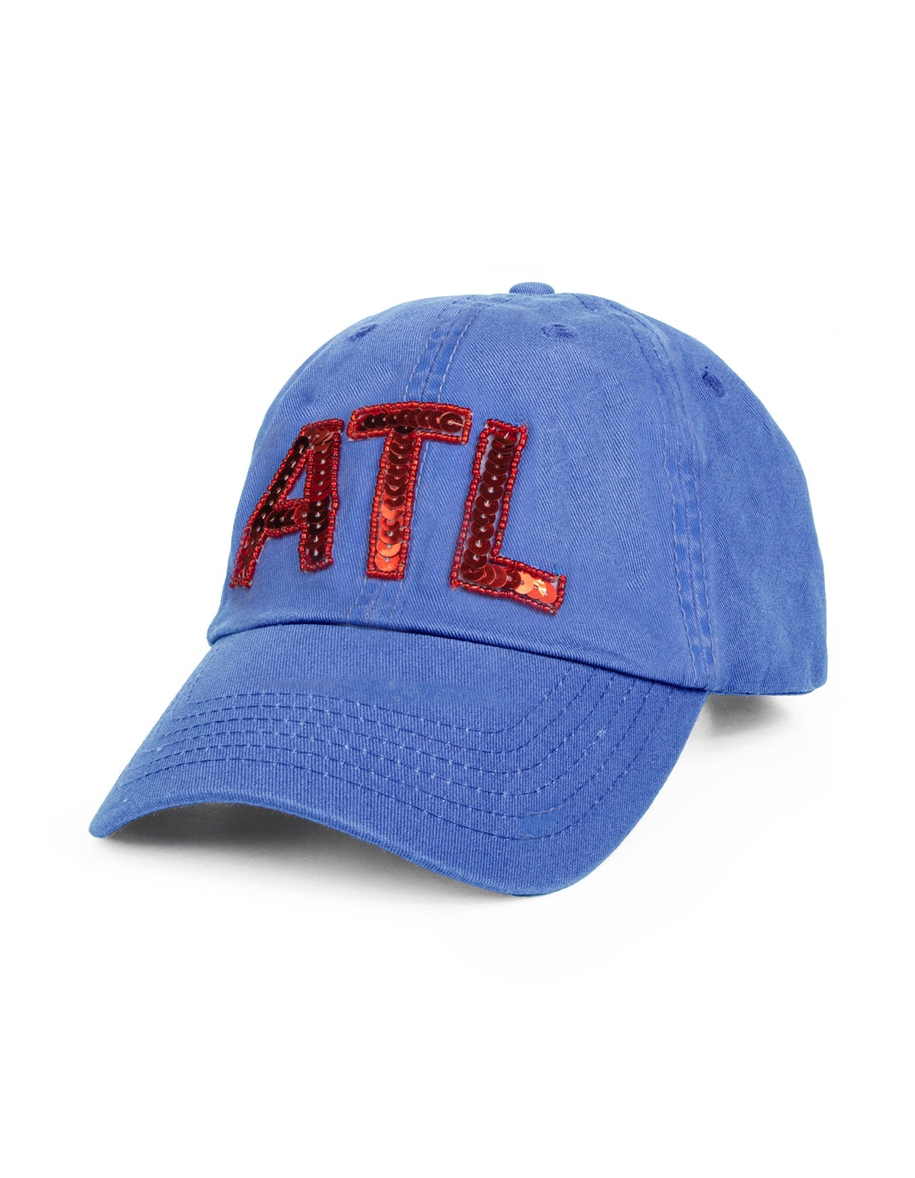 Faded blue hat with ATL sequin handmade letters on the front.