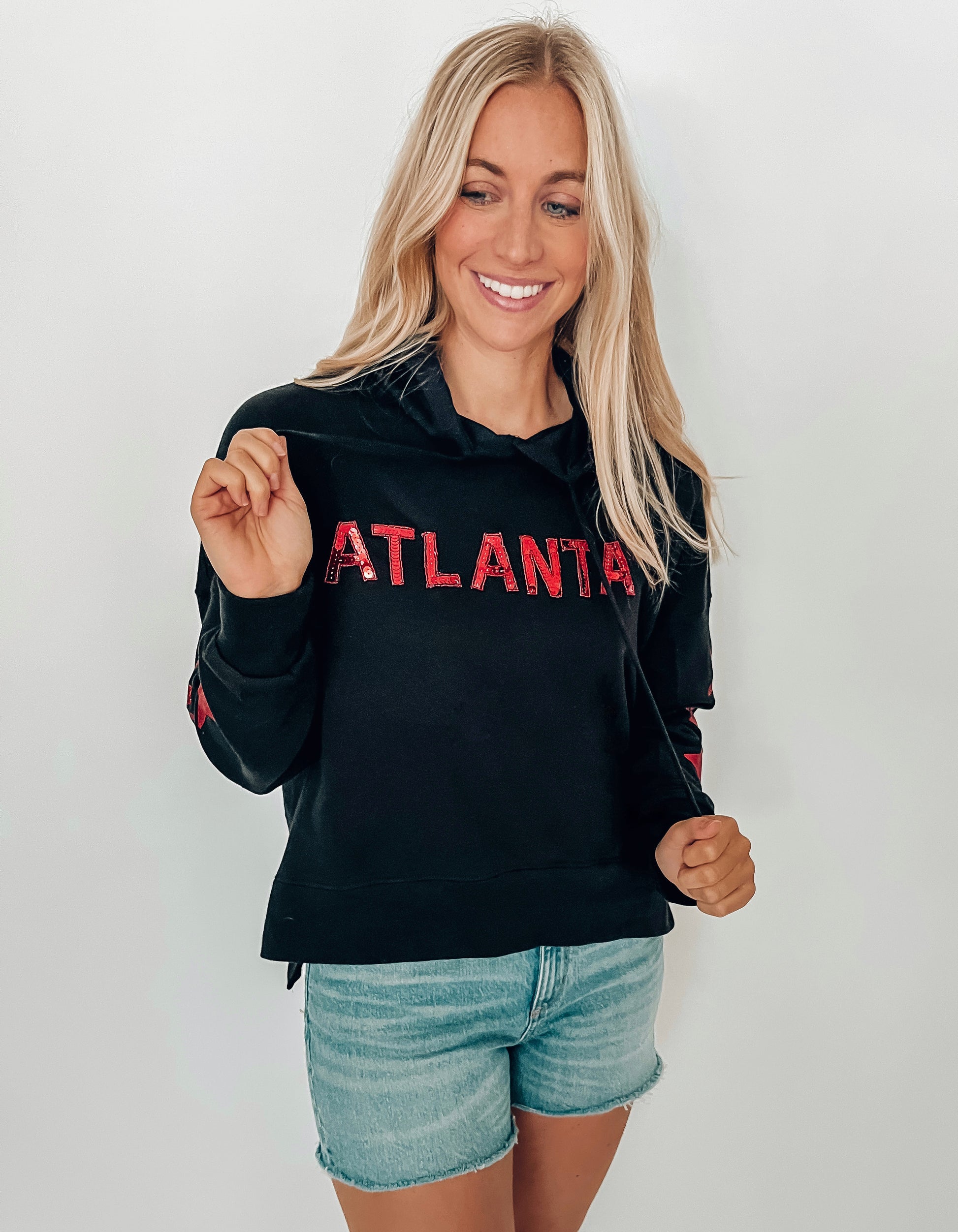 Black cropped hoodie with side slits and Atlanta red sequin letters on the front, along with red shimmer stars on the sleeves.