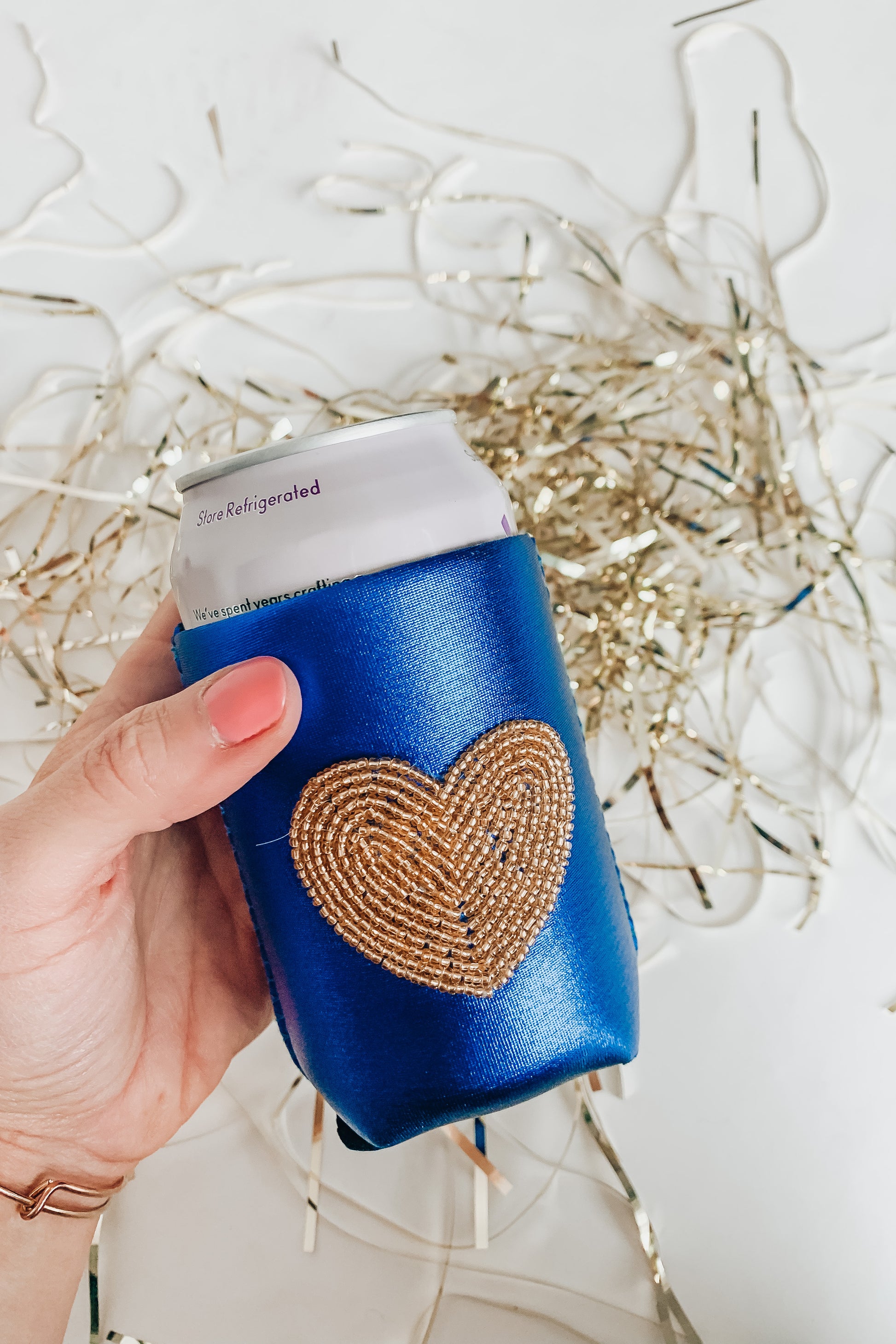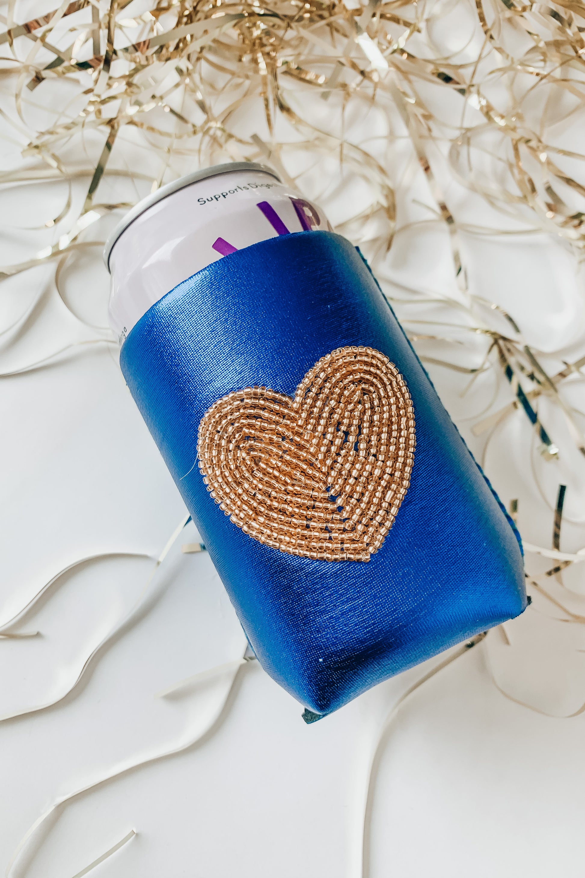Beaded gold heart on a blue koozie! Fits regular size cans.