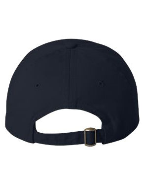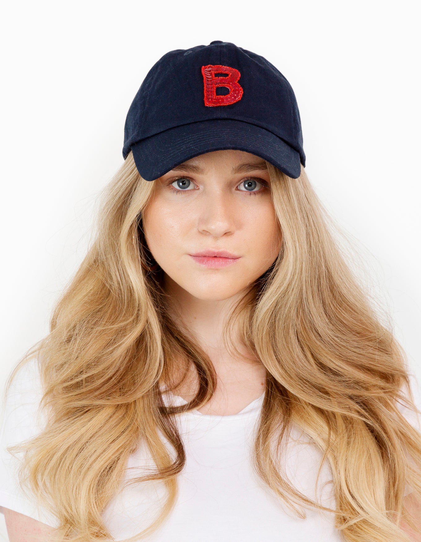 Navy baseball dad hat with a handmade sequin "B" letter patch on the front. Adjustable back. Chino twill fabric. Unstructured.