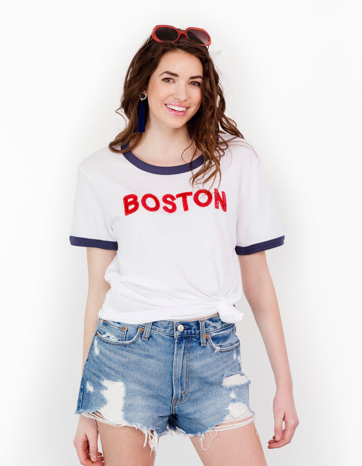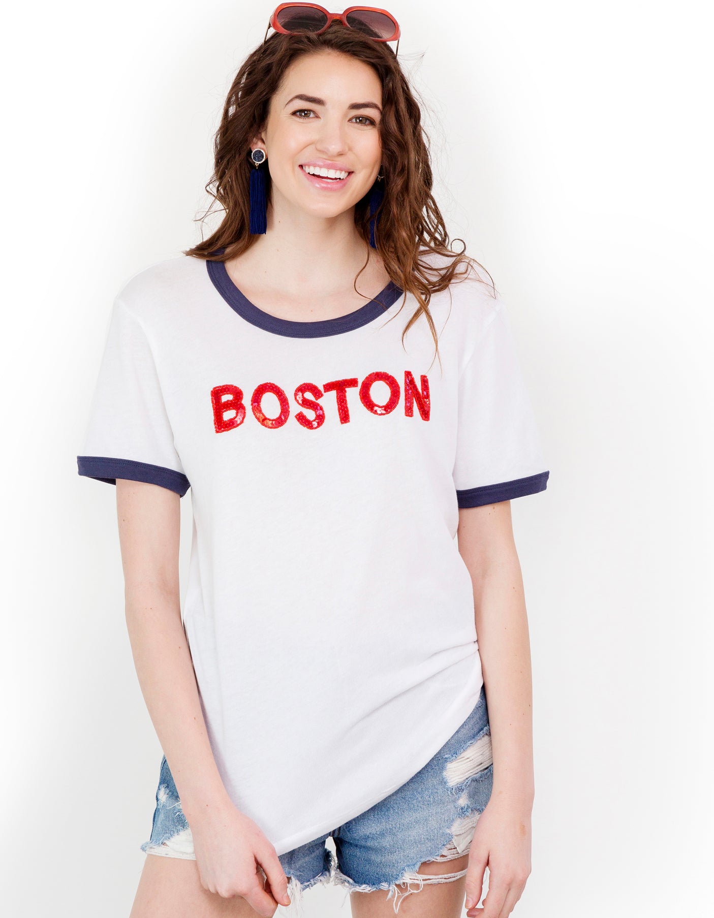 Ringer style tee with handmade red sequin letters on the front. Fits oversized. Model is wearing a small.