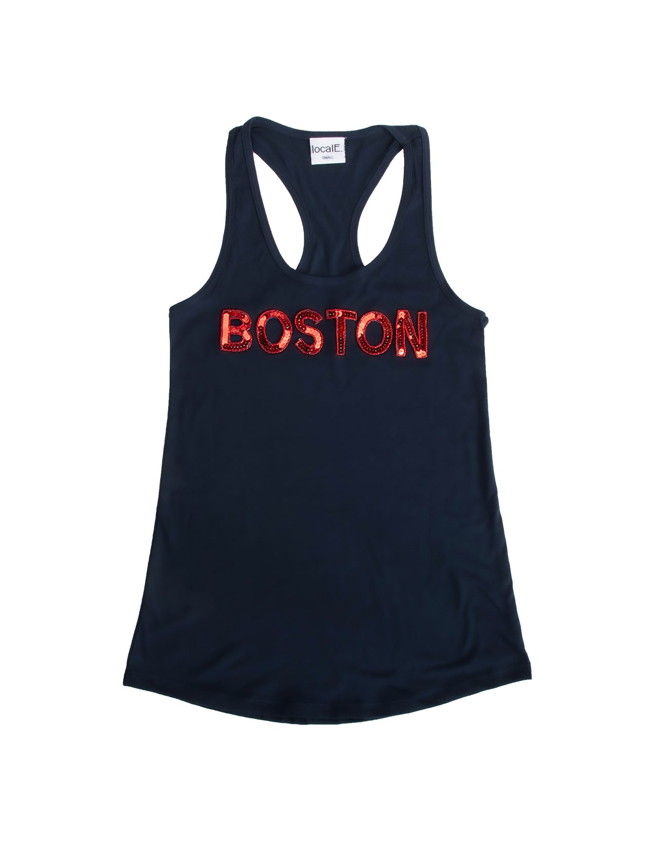 Navy racerback tank with handmade red sequin letters on the front. Fits true to size.