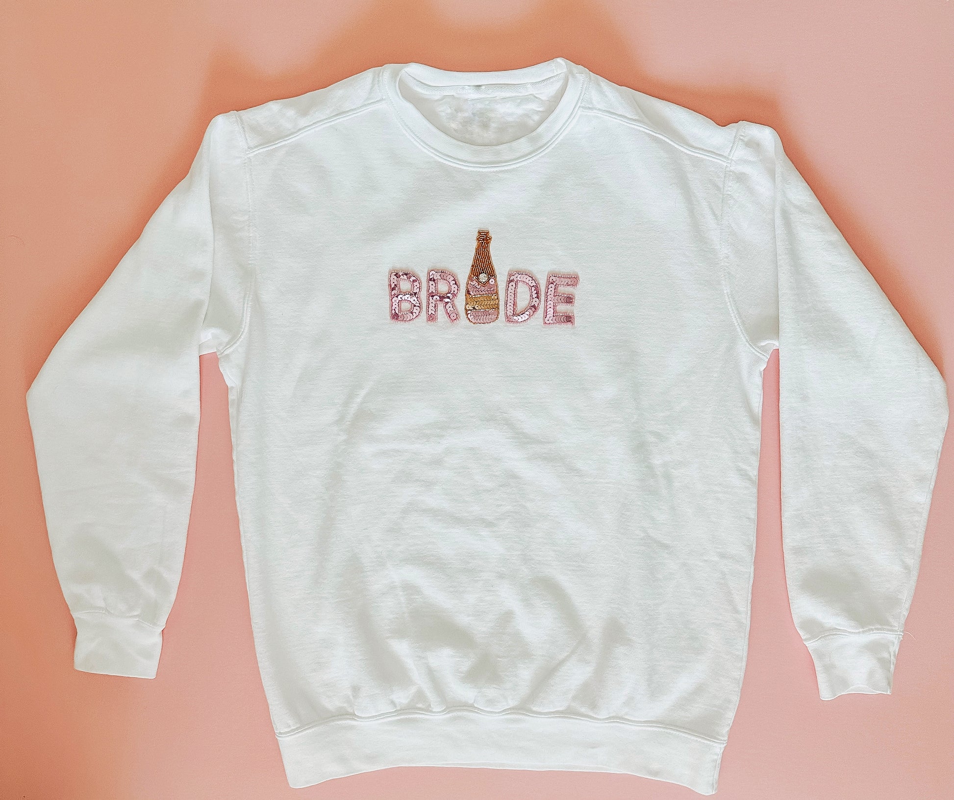 White crew neck sweatshirt with handmade sequin letter patches on the front.