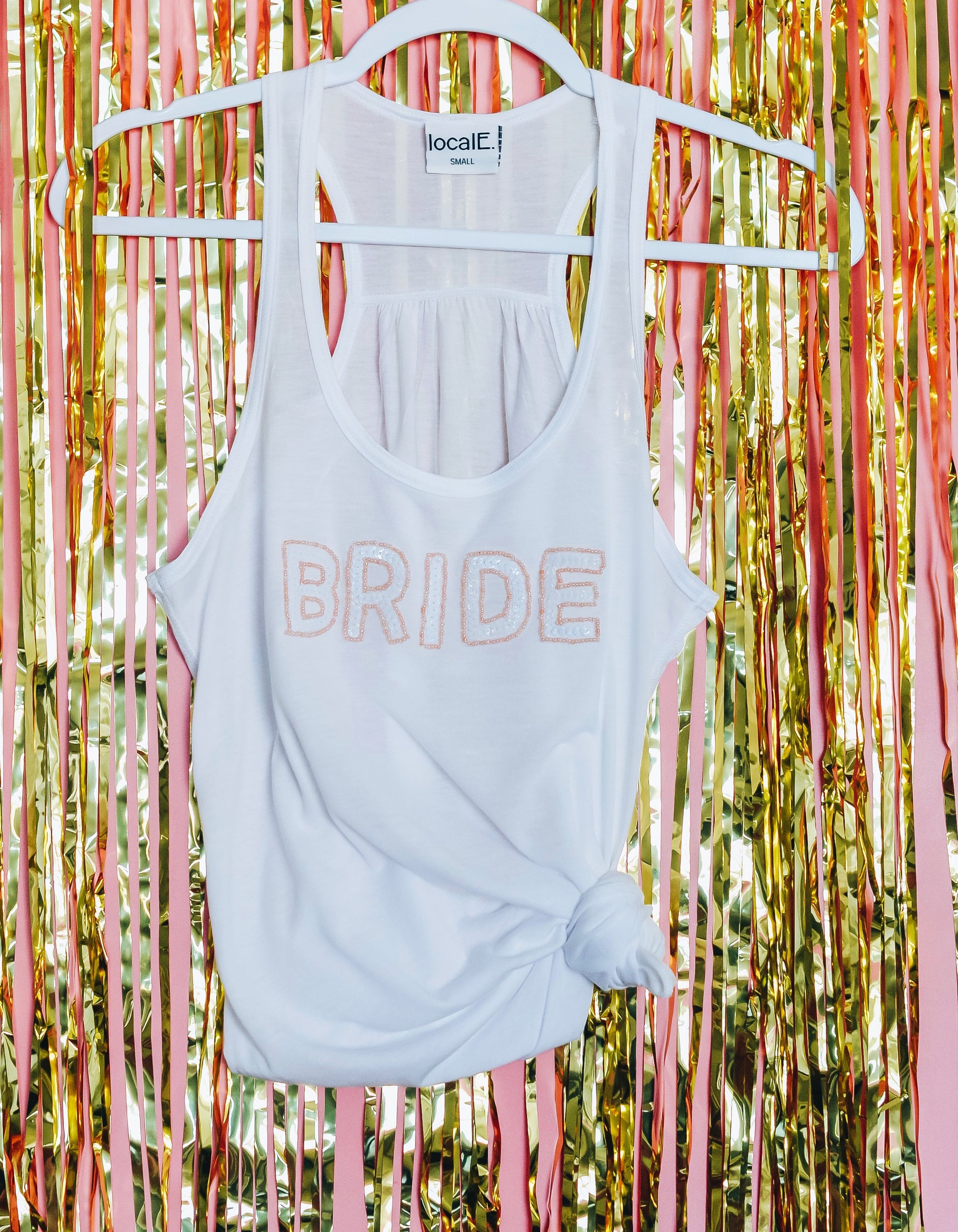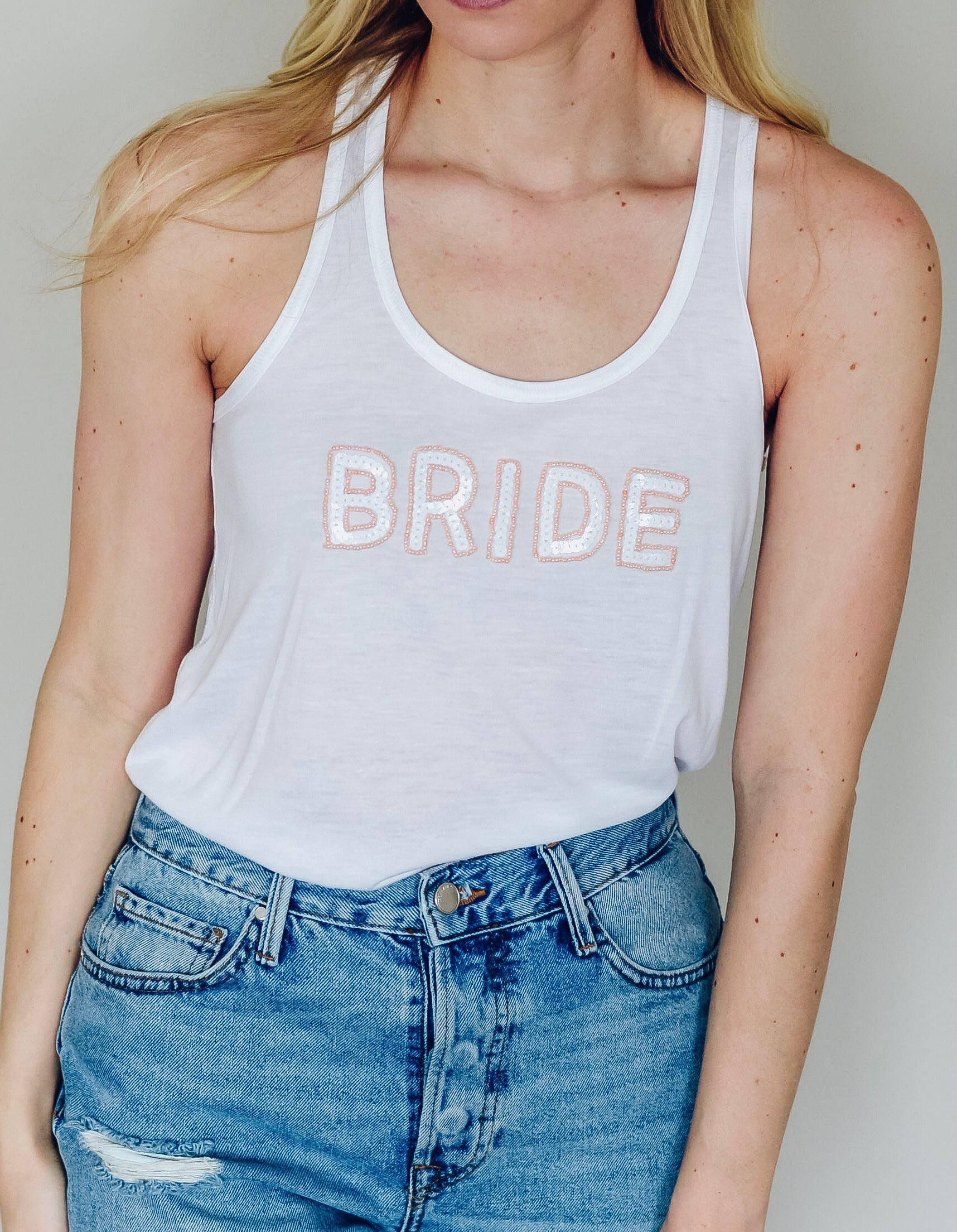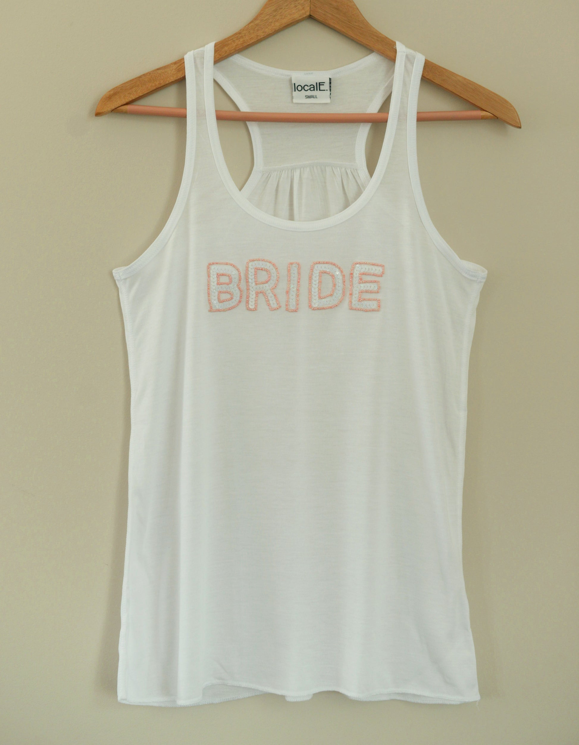 Racerback tank with a flowy fit. Handmade sequin letter patches on the front.