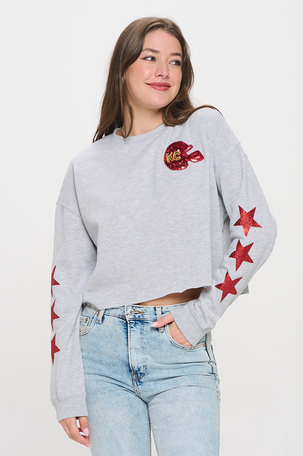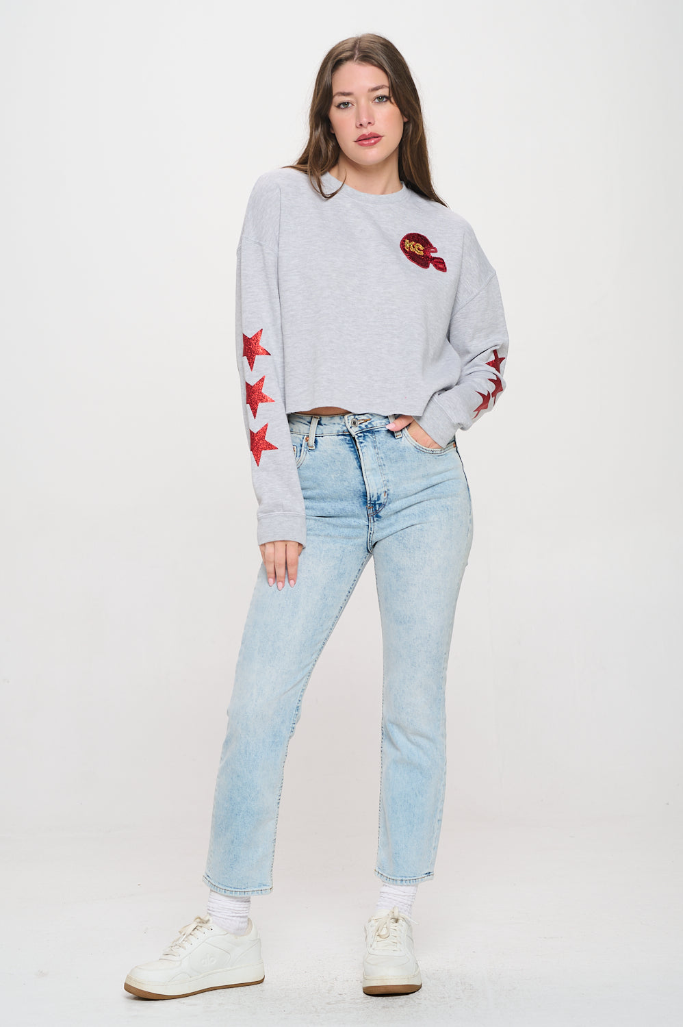 Our Cropped KC Sequin Helmet Sweatshirt has the perfect amount of sparkle for Chiefs fans! The super soft fleece tri-blend fabric will give you a lightweight and comfortable fit!