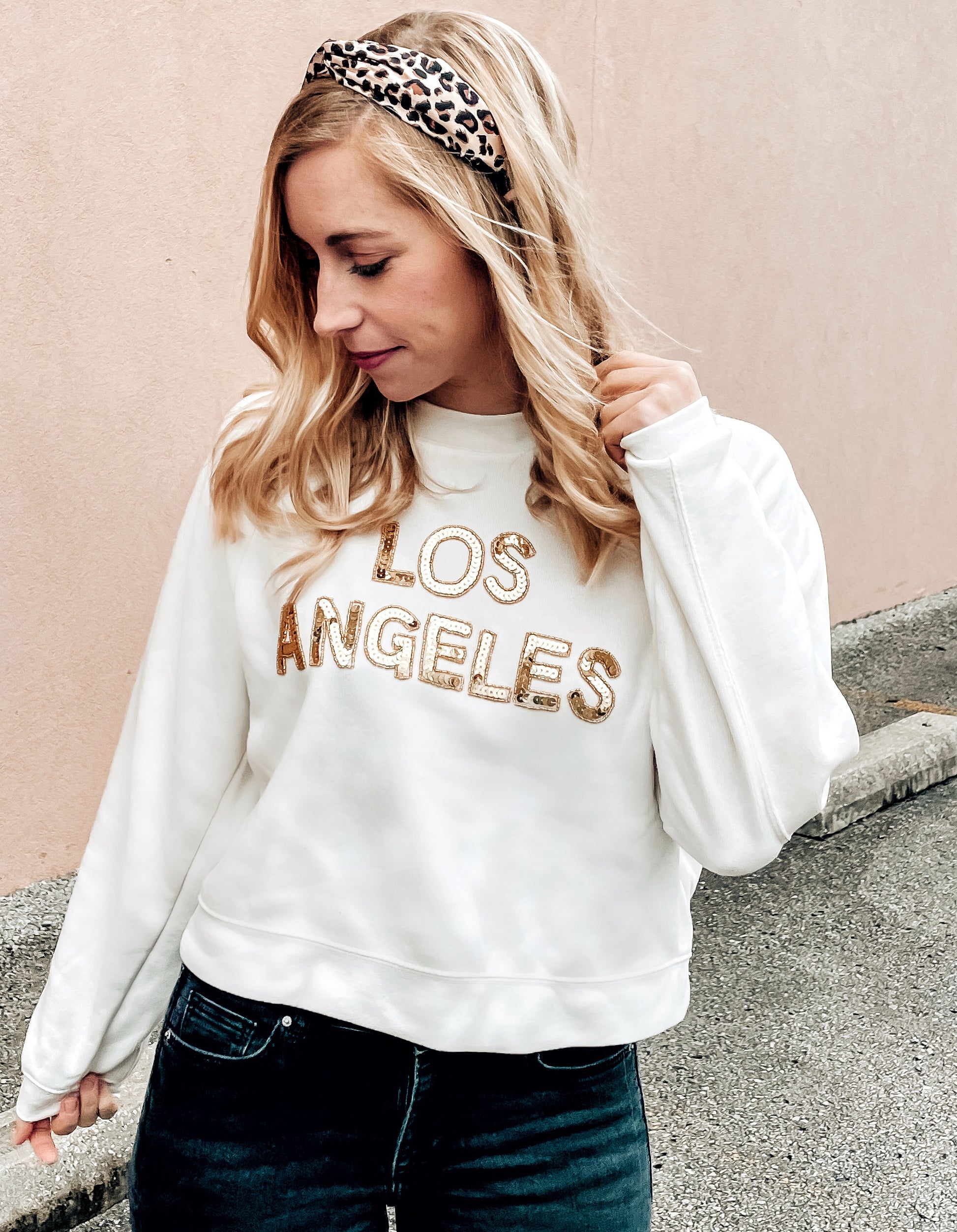 Cropped cream sweatshirt with gold Los Angeles sequin letters on the front. True to size with a relaxed fit. Model is wearing a medium.