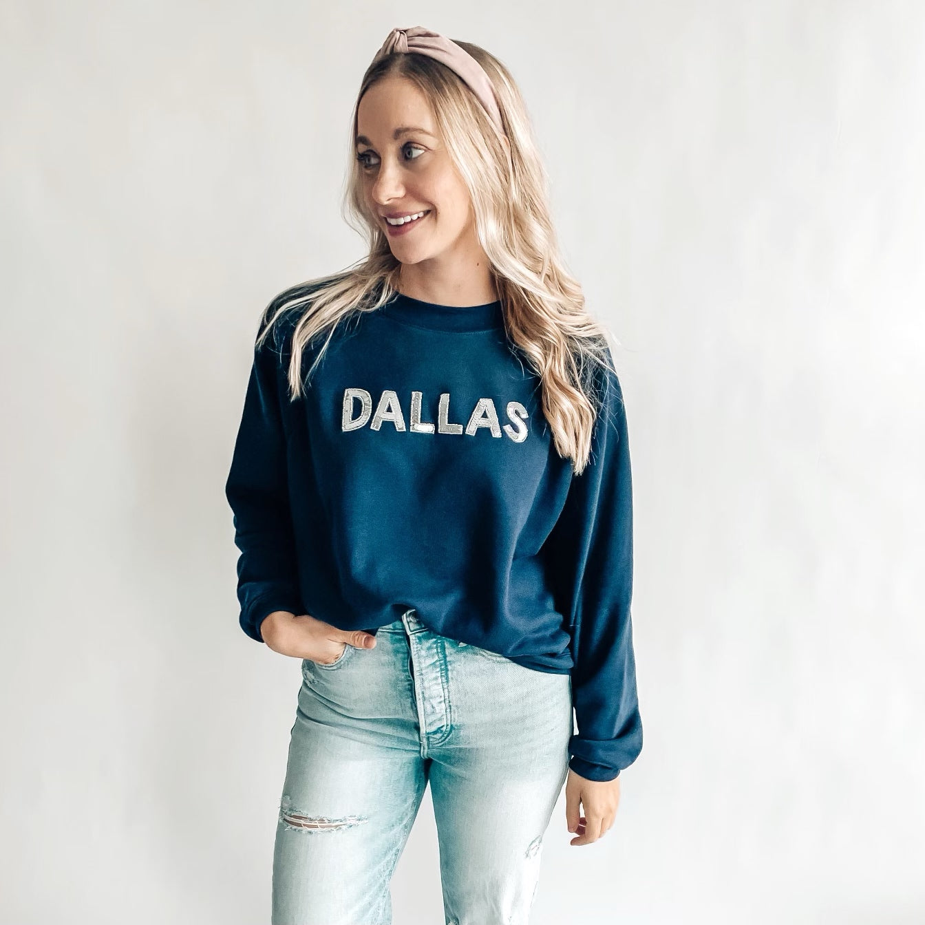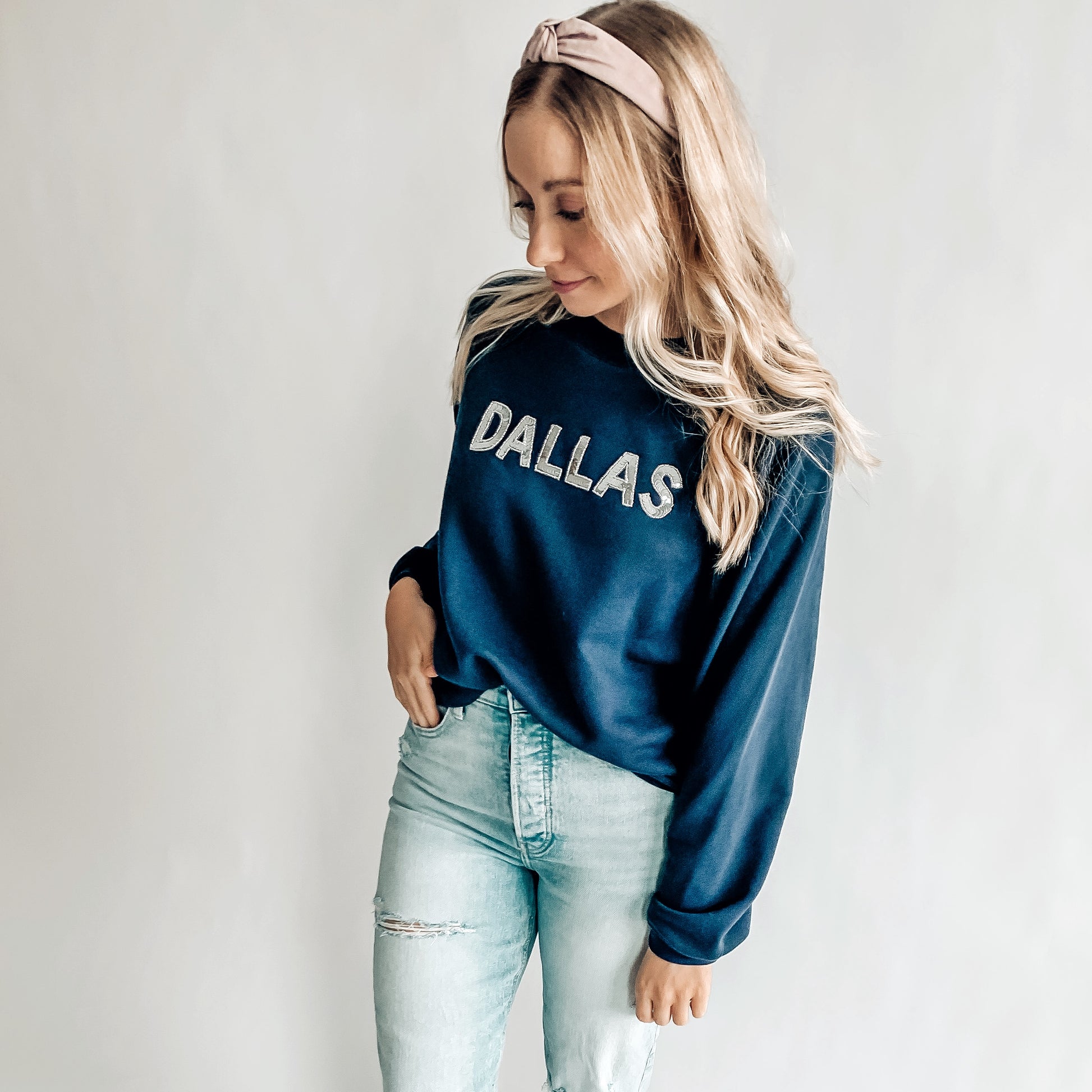 Super soft navy sweatshirt that has a slight crop with Dallas sequin letter patches in silver.