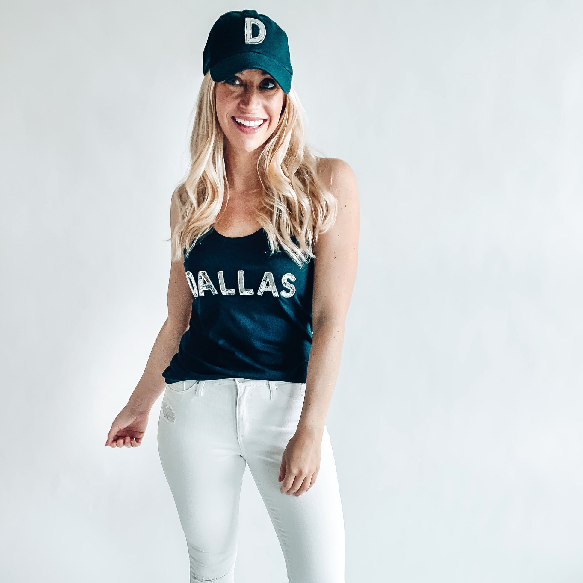 Navy racerback tank with silver Dallas sequin letters on the front.