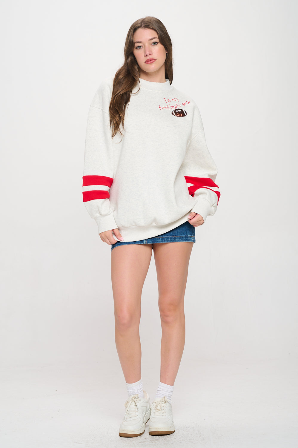 Our Football Era Varsity Sweatshirt has the perfect amount of sparkle for Chiefs and Taylor Swift fans! This is a heavy weight fabric with wide sleeves for a relaxed fit. Red varsity stripes on the sleeves. "In My Football Era" is embroidered on the front, along with a sequin football patch.