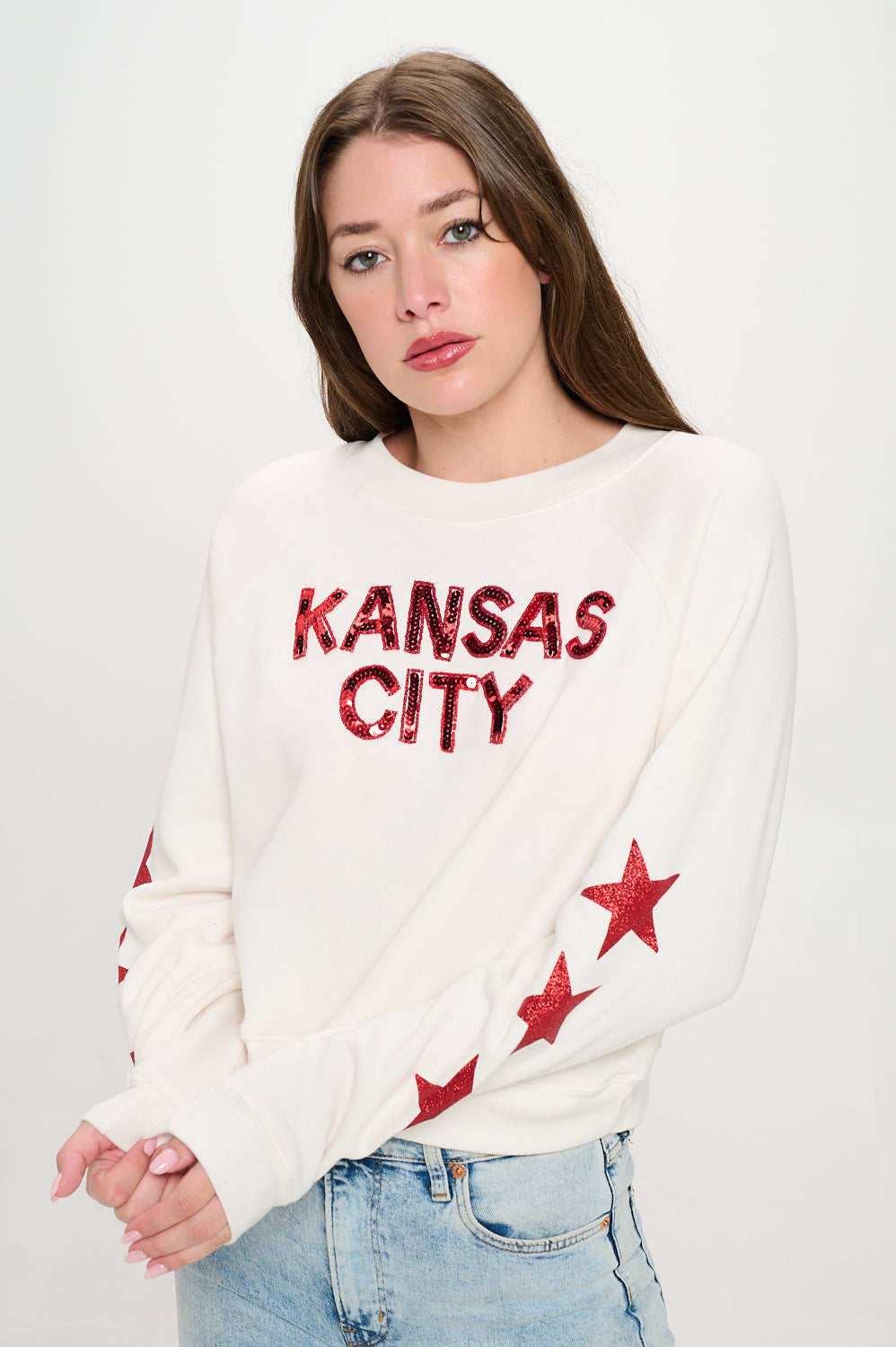 Cropped cream sweatshirt with red glitter stars and red sequin letter patches.