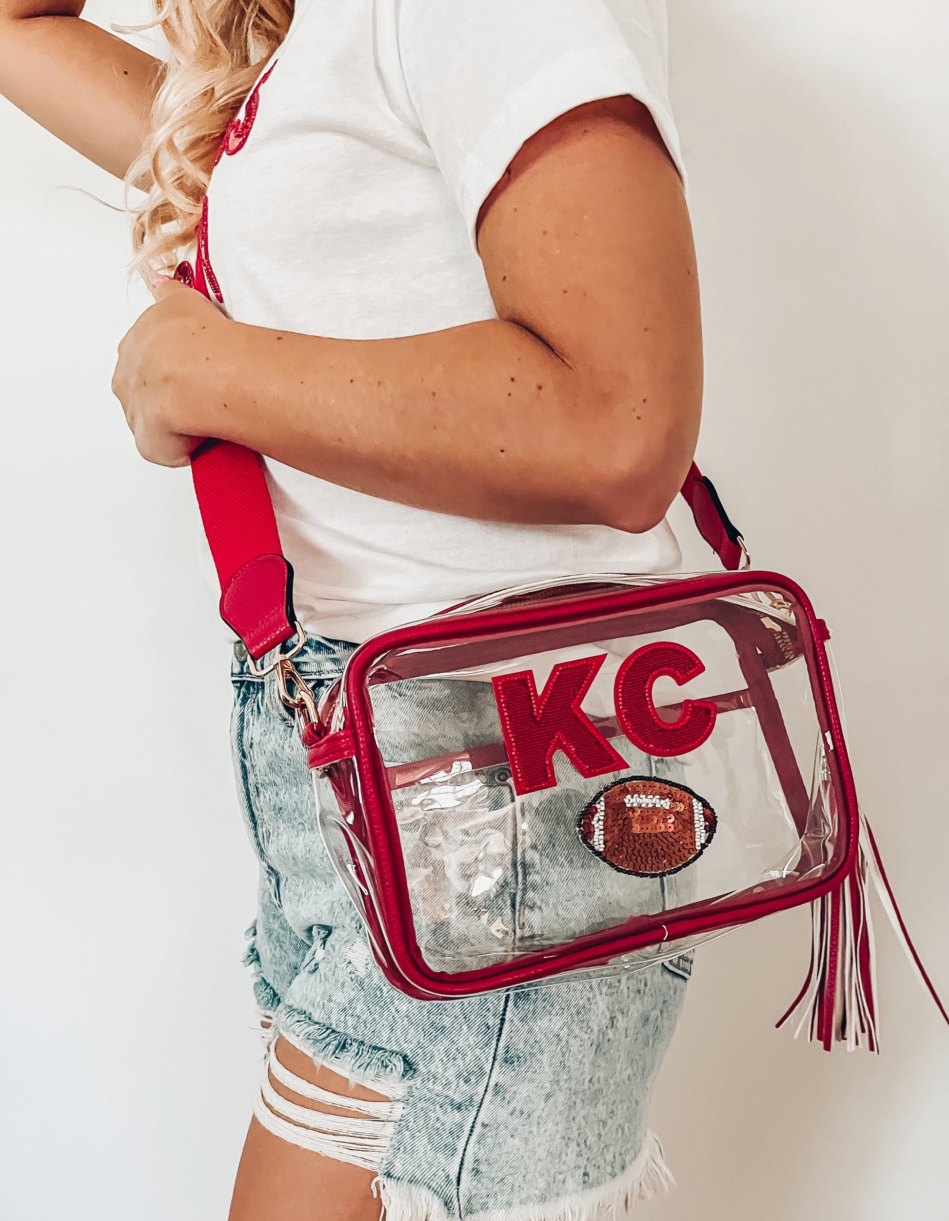 Clear stadium bag with red strap and red outline. KC sequin letters and sequin football patch on the front.