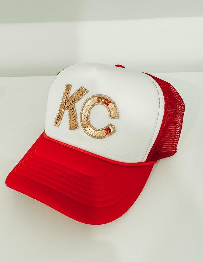 Red and whit trucker hat with gold KC sequin letters on the front. Snapback style.