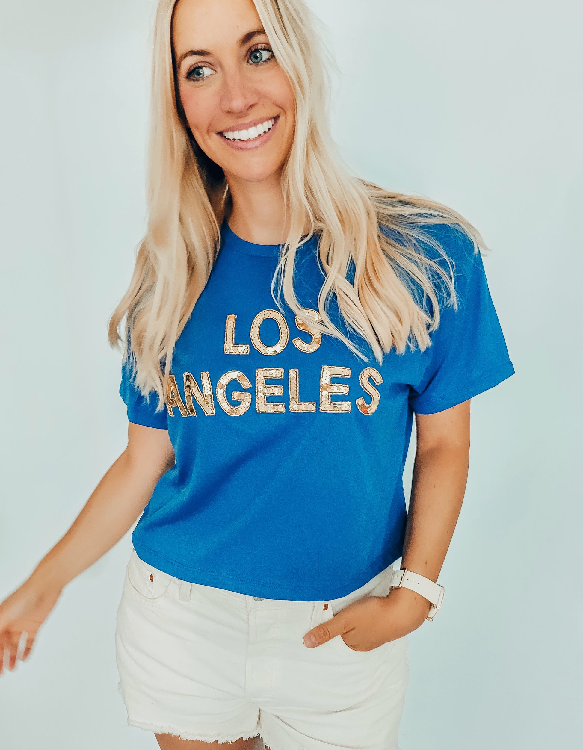 The Los Angeles Blue Sequin Cropped Tee has a classic crew neckline with short sleeves and "Los Angeles" in gold handmade sequin patches across the front. This is great for game day!