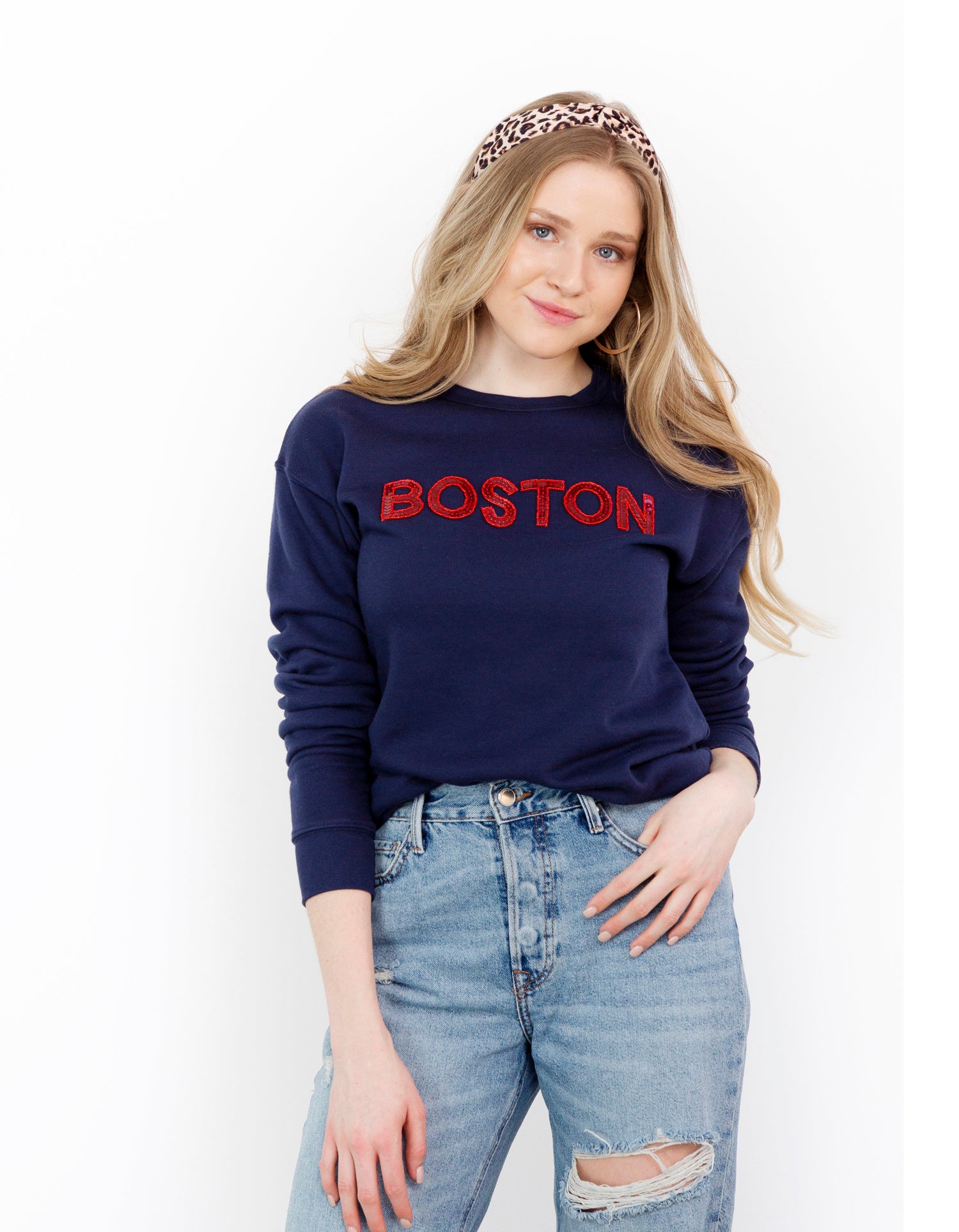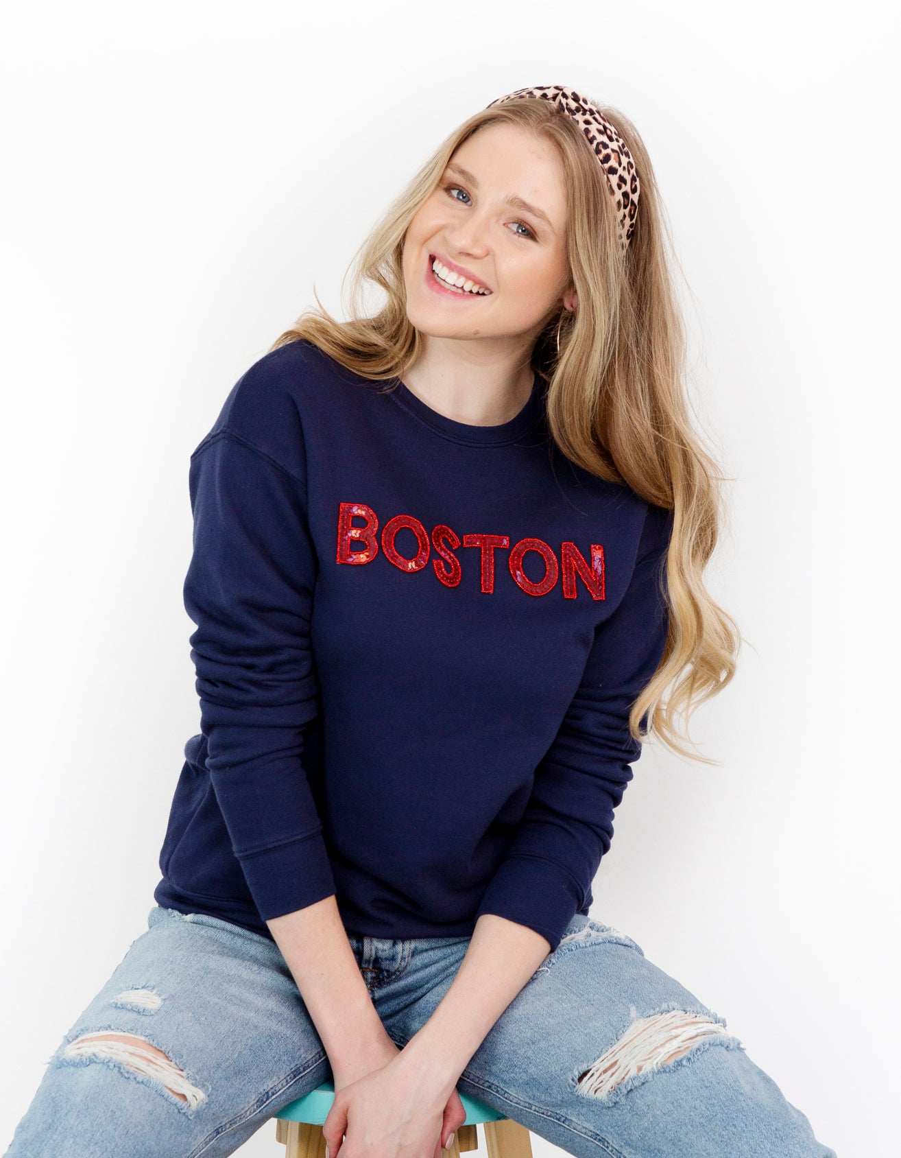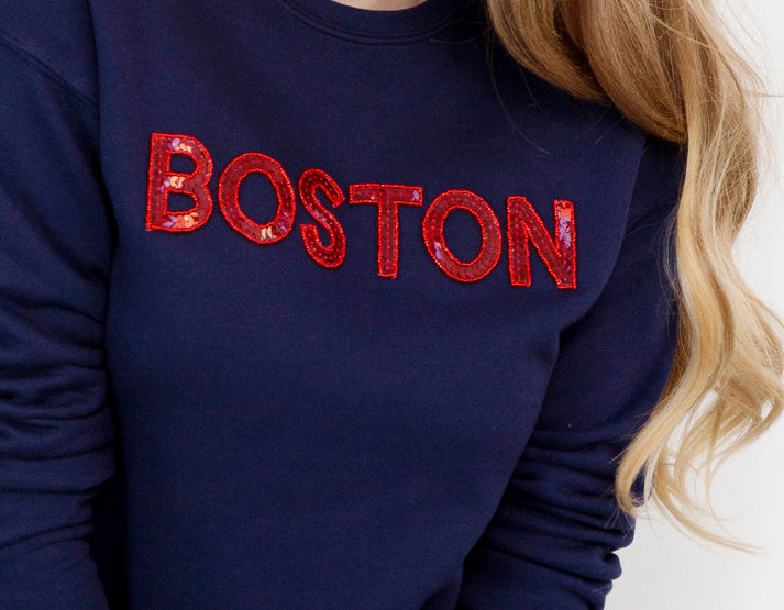 A super soft crewneck sweatshirt with "BOSTON" handmade sequin letters on the front. Lightweight fabric. Fits true to size. Model is wearing a small.
