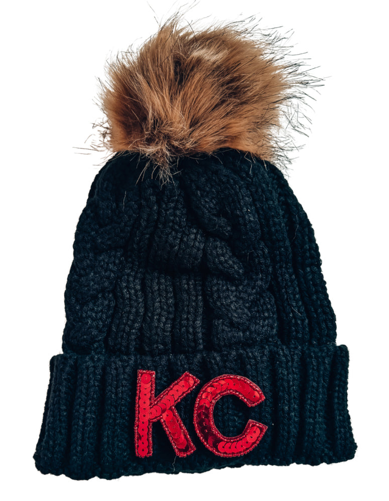 Black knit beanie with red KC sequin letters on the front and brown pom.