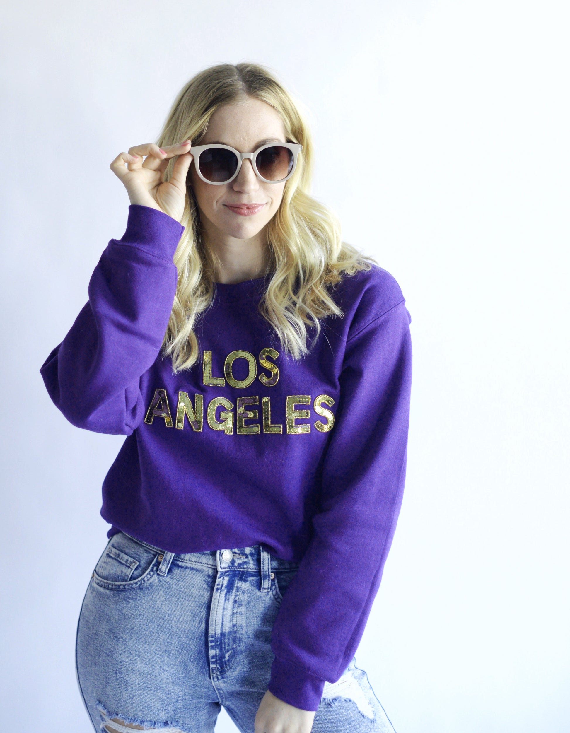 Purple sweatshirt with gold Los Angeles sequin letters on the front. True to size with a relaxed fit. Model is wearing a small.