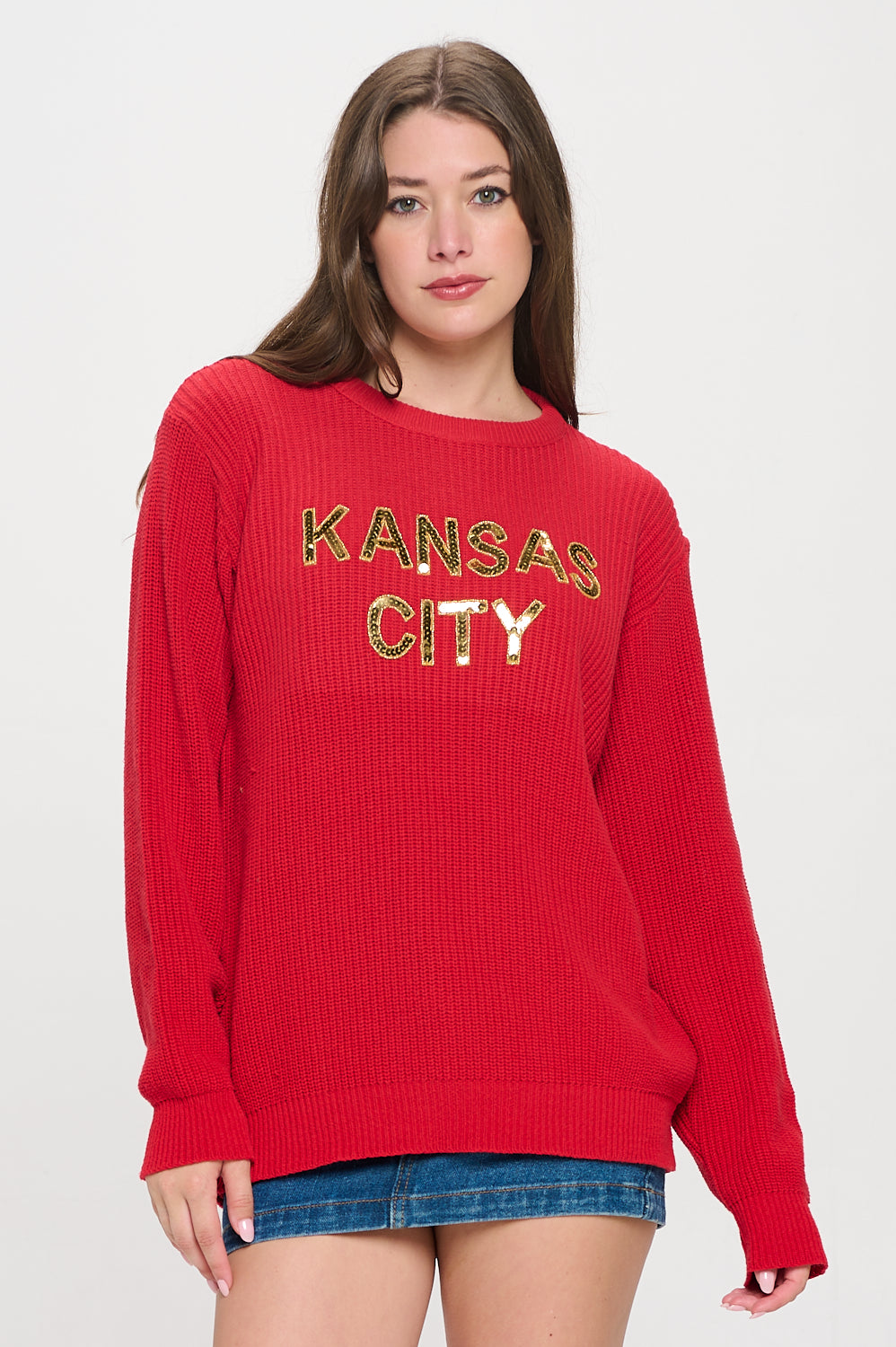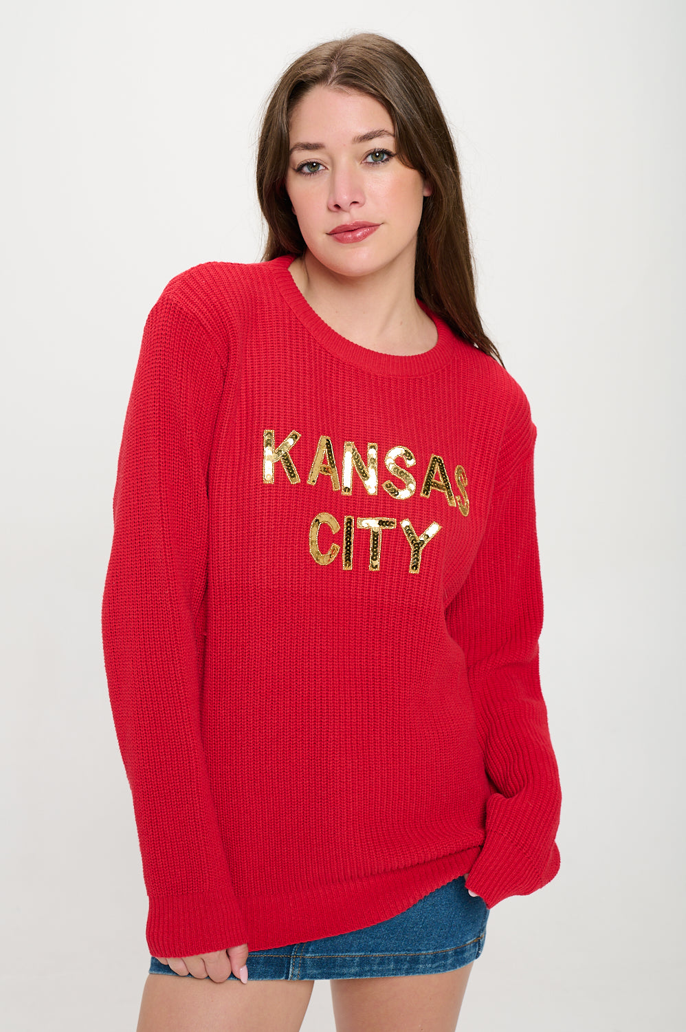 Our Red Kansas City Sequin Sweater has the perfect amount of sparkle for gameday! 100% cotton shaker knit sweater. Heavy weight ribbed knit. It has a chunky heavy weight feel.