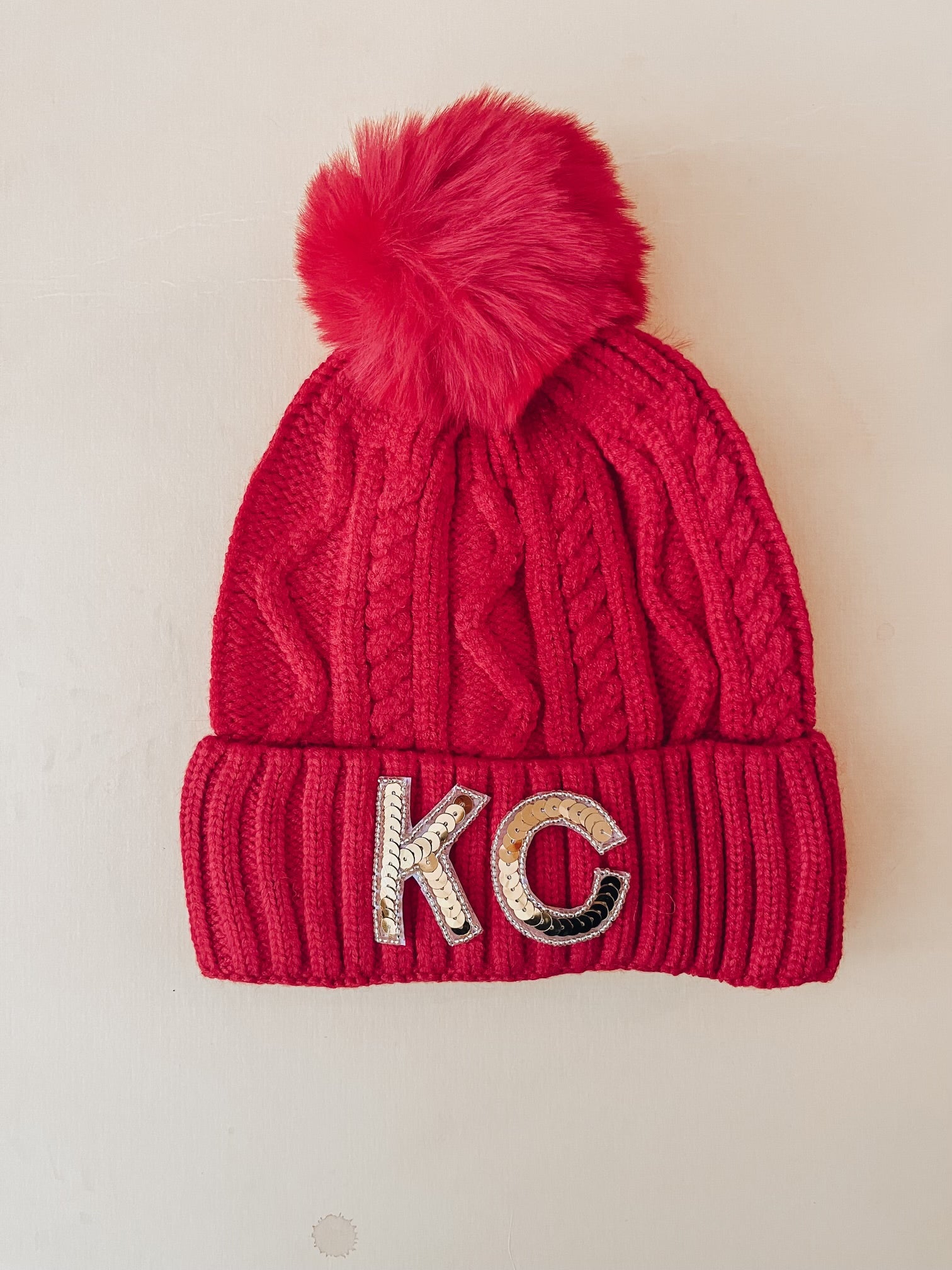 Red knit beanie with gold KC sequin letters on the front.