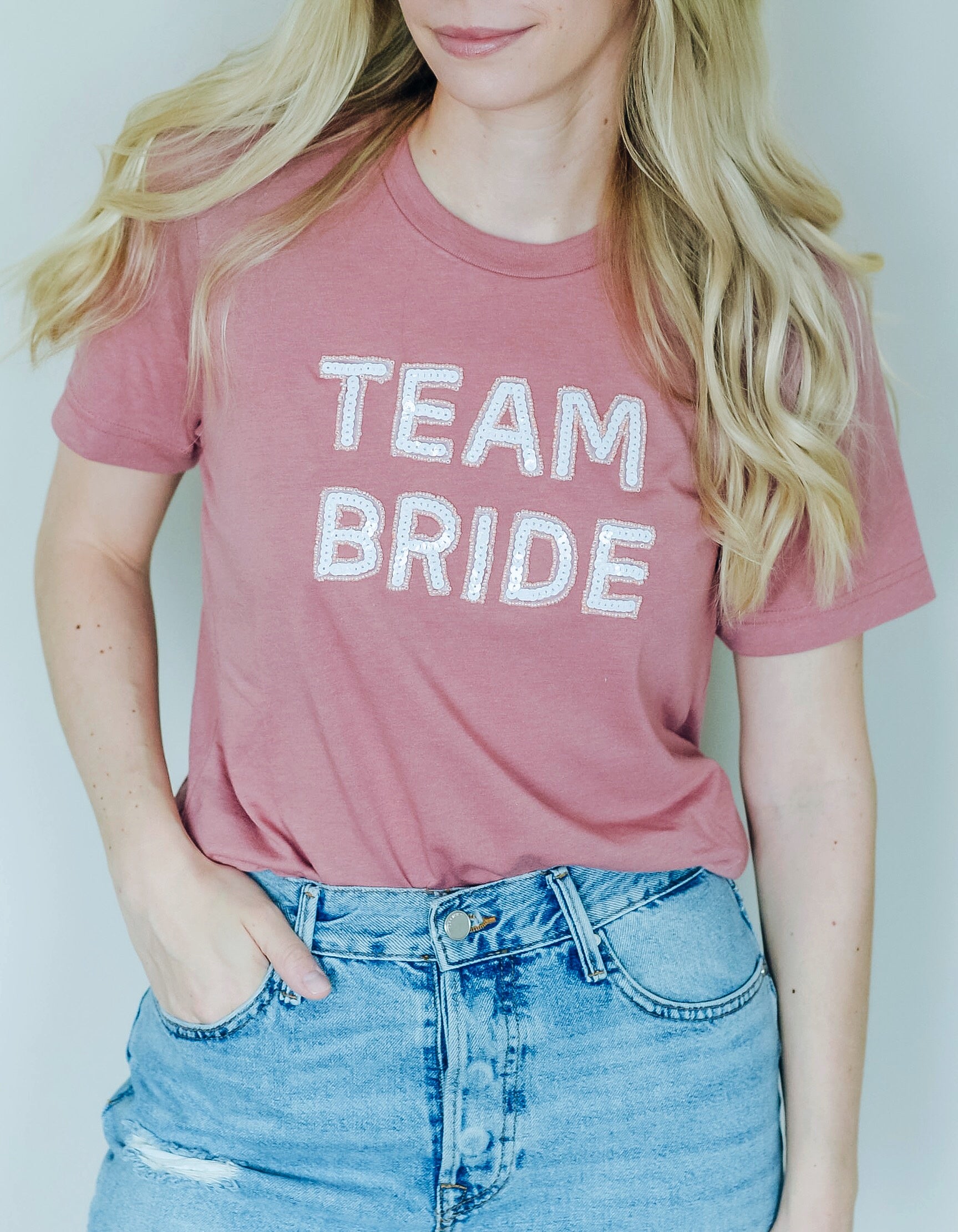 Mauve crew t-shirt with Bride sequin letters on the front.