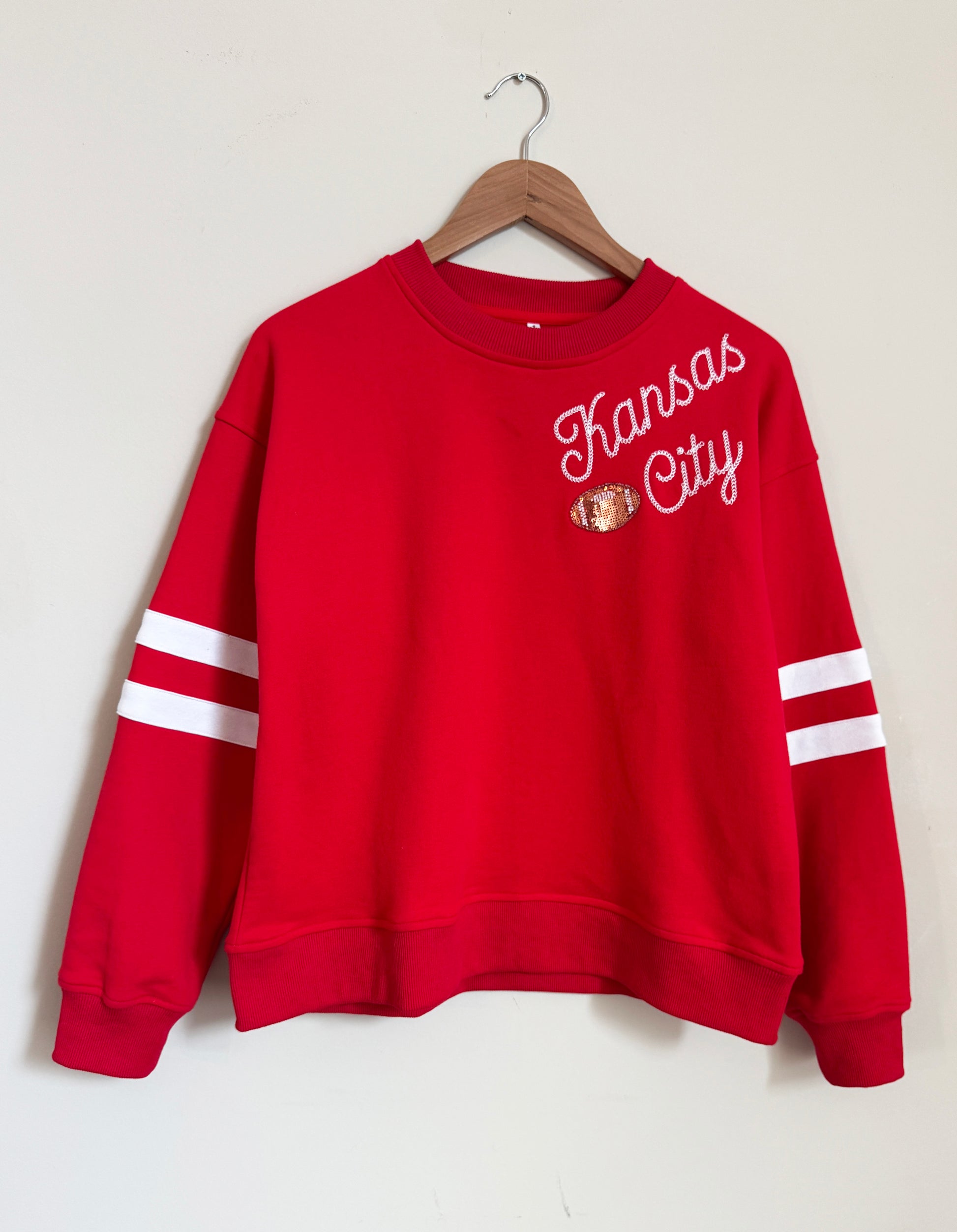 Our Varsity Kansas City Football Sweatshirt has the perfect amount of sparkle for gameday! Embroidered Kansas City with a sequin football on the front.