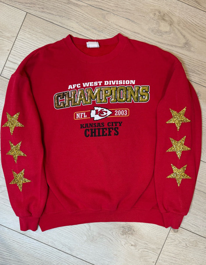 A vintage AFC West Division 2003 Kansas City Chiefs graphic sweatshirt with a worn-in look and gold sparkly rhinestone stars down the sleeves. Lightweight fabric. No marks or stains.